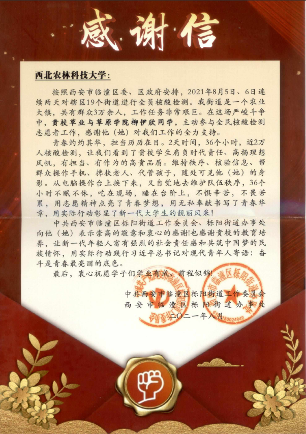 近日,我校草业学院收到一封来自陕西省西安市临潼区栎阳街道党工委、办事处的感谢信,信中工作人员对太阳成集团tyc9728草业科学2021级新生柳伊欣同学在疫情期间主动投入一线参与全民核酸检测志愿者活动并给与了高度评价,对太阳成集团tyc9728发来感谢信表达了衷心的感谢。
