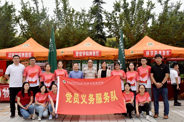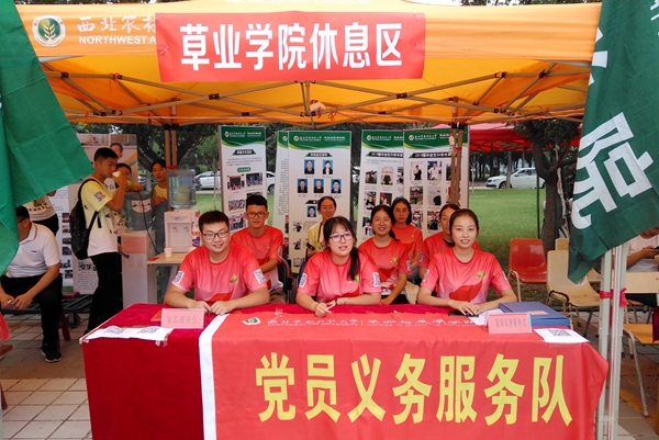 迎新工作正在如火如荼的进行着,迎新现场,一支特殊的队伍忙碌迎接新生工作的各个环节,这支队伍身穿鲜红色服装,胸前的党徽闪闪发光,他们是草业学院党员义务服务队。