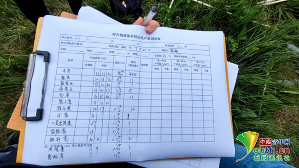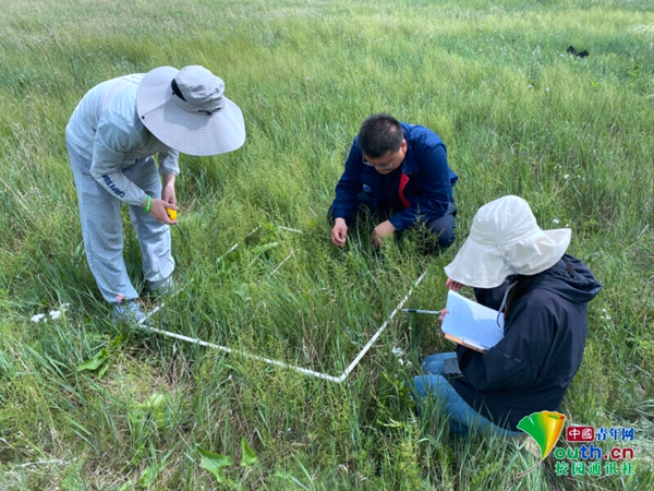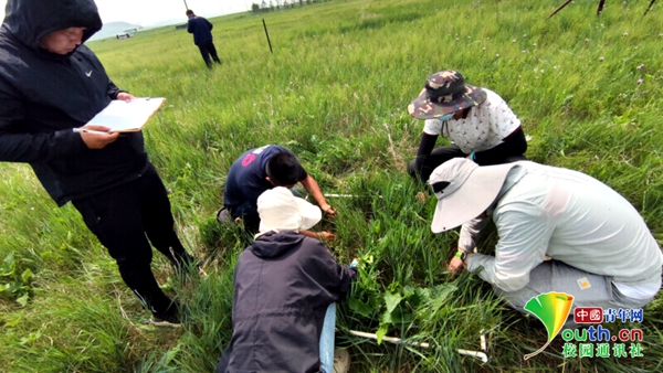 图为实践团队成员详细记录乌拉盖草原各种植物高度、盖度、密度等指标具体数据 中国青年网通讯员 邵梓桐 摄
