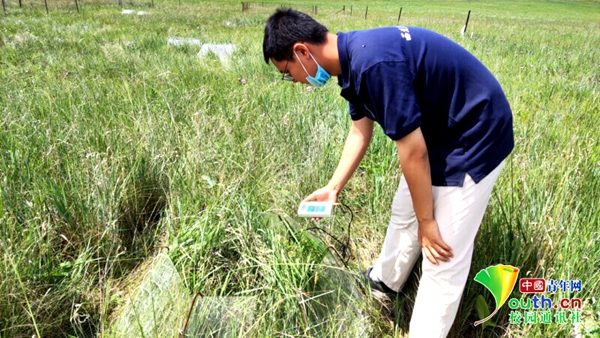 图为实践团队成员正在测量乌拉盖草原表层土壤温度 中国青年网通讯员 何佳 摄