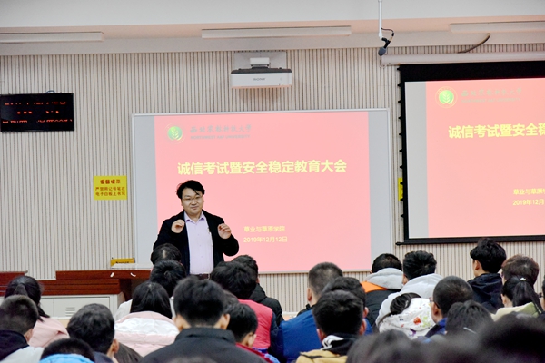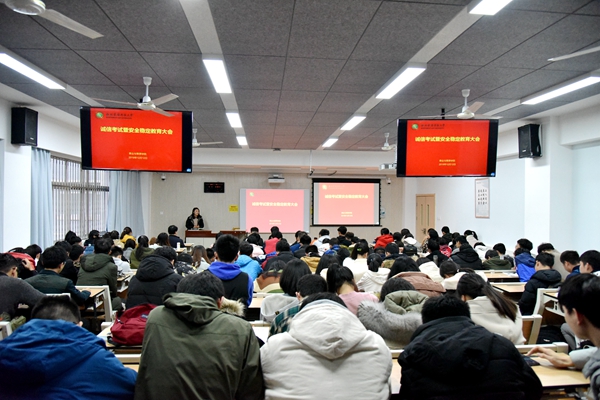 为严肃考风考纪,营造文明、诚信的良好学风氛围;为进一步提高学生安全意识,营造健康向上的校园文化氛围。太阳成于12月12日下午在8号教学楼召开诚信考试暨安全稳定教育大会。学院副院长杨培志、辅导员郭燕楠、全体2018、2019级本科生参加会议,会议由辅导员郭燕楠主持。